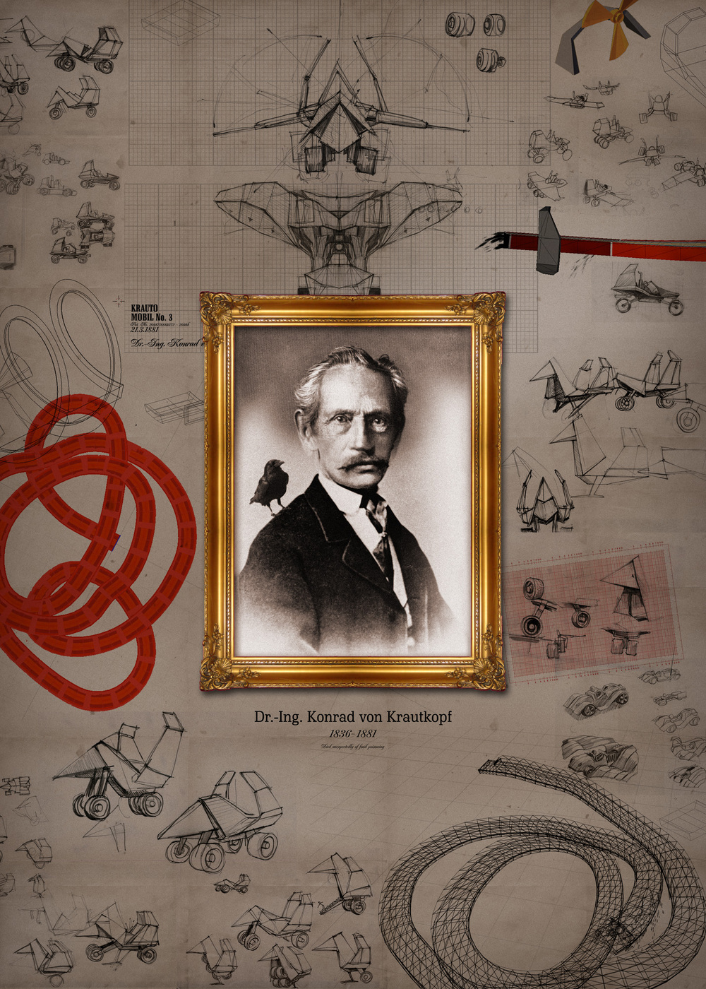 Konrad von Krautkopf died unexpectedly towards the end of 1881 of food poisoning, after a prolonged effort to re-invent the wheel. During this time he forgot to eat and when he eventually rewarded his efforts with dinner, he unluckily consumed rotten meat. Nobody knew what exactly happened, but very soon after this sad event, his old „friend“ Carl Benz invented a suspiciously similar vehicle, but without wings. Carl Benz, who of course claimed that he invented everything by himself, couldn‘t make out all the detailed plans properly and therefore only managed a half assed attempt at building one of these flying cars – he was so confused by the complexity of the ingenious arrangements, so that he was completely unable to understand the mechanics of the wings. Upon failing to build a prototype, he eventually drew up plans for a so called „Automobil“, which operated with dirty gasoline instead of wind energy, as Konrad for Krautkopf suggested in his plans. To further cover up the truth about Dr. von Krautkopf's great invention, his „friend“ even started to discredit his name to make sure nobody even starts to think about how it really happened.